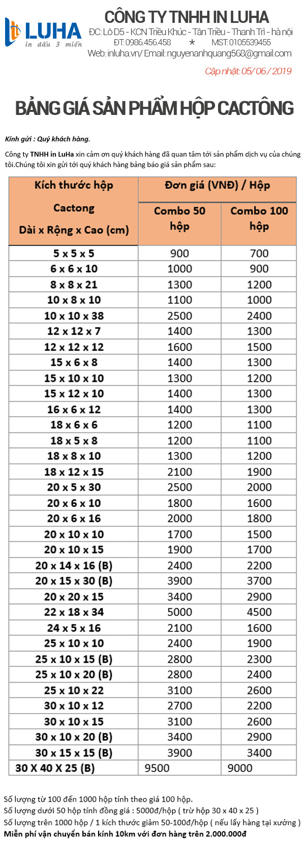 BẢNG GIÁ SẢN PHẨM HỘP CARTONTác giảAdministrator23:21 - 07/08/2019 Công ty TNHH in LuHa xin cảm ơn quý khách hàng đã quan tâm tới sản phẩm dịch vụ của chúng tôi.Chúng tôi xin gửi tới quý khách hàng bảng báo giá sản phẩm.